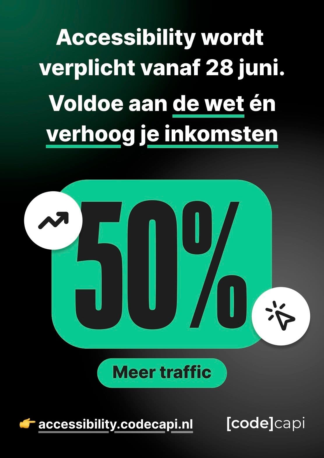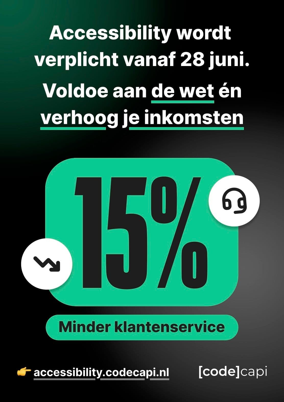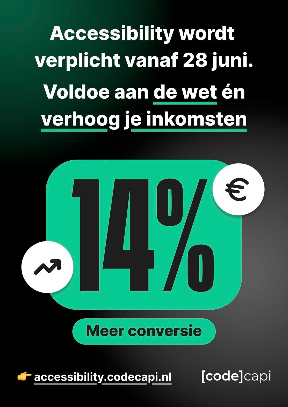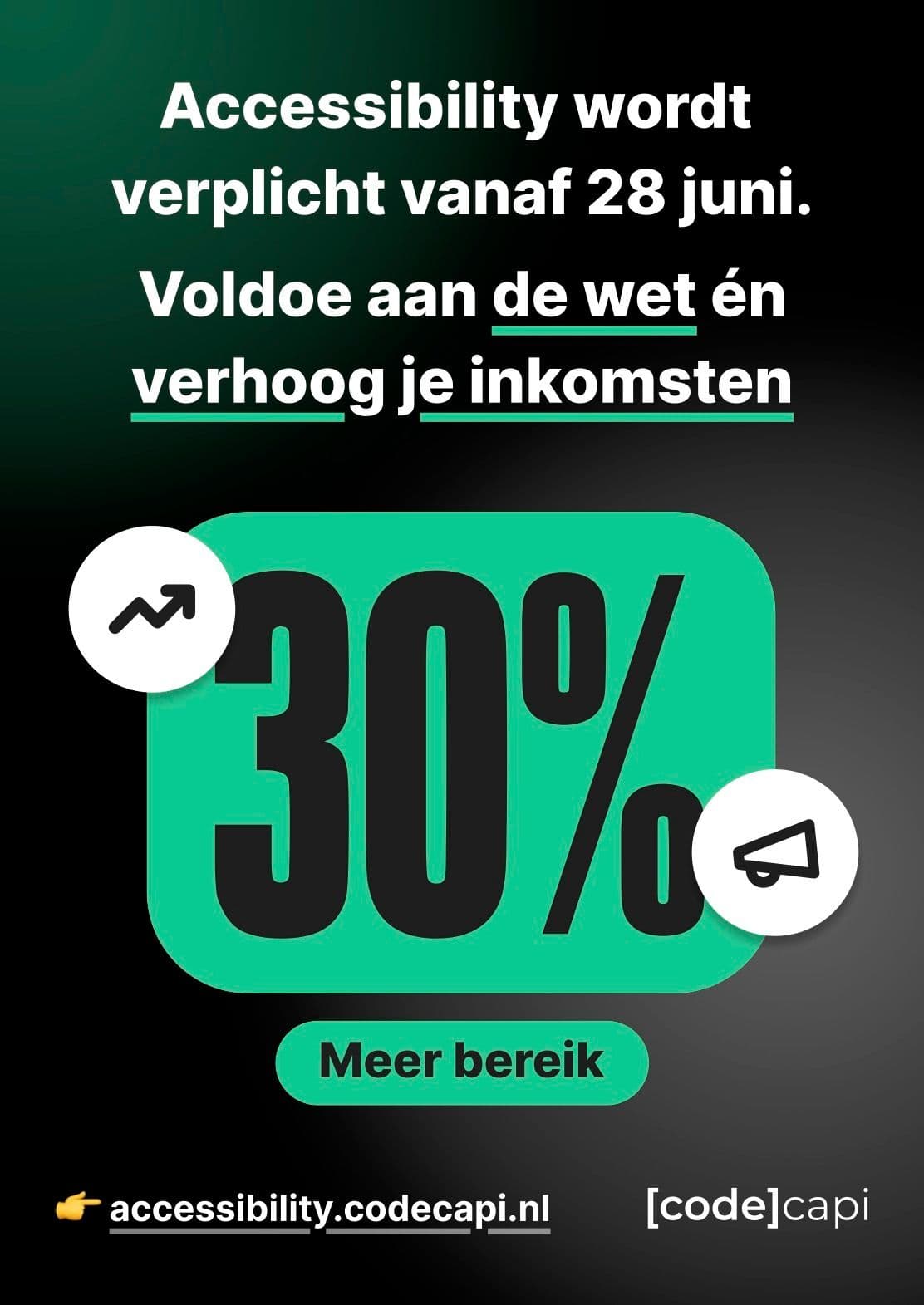 69% van mensen met een functiebeperking klikt een ontoegankelijke website meteen weg. In Nederland gaat dat om ruim 2,4 miljoen gebruikers. Omgerekend: โฌ1.420 omzetverlies per gebruiker per jaar. (๐๐ณ๐ฐ๐ฏ: ๐๐ฎ๐ฆ๐ณ๐ค๐ฆ)