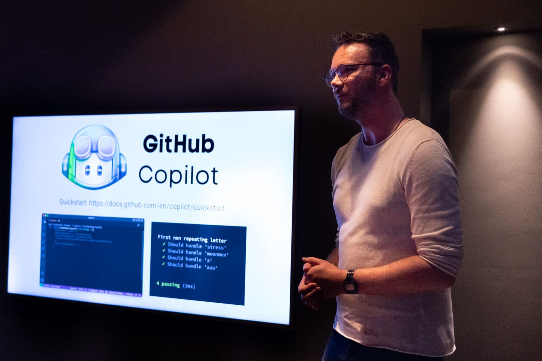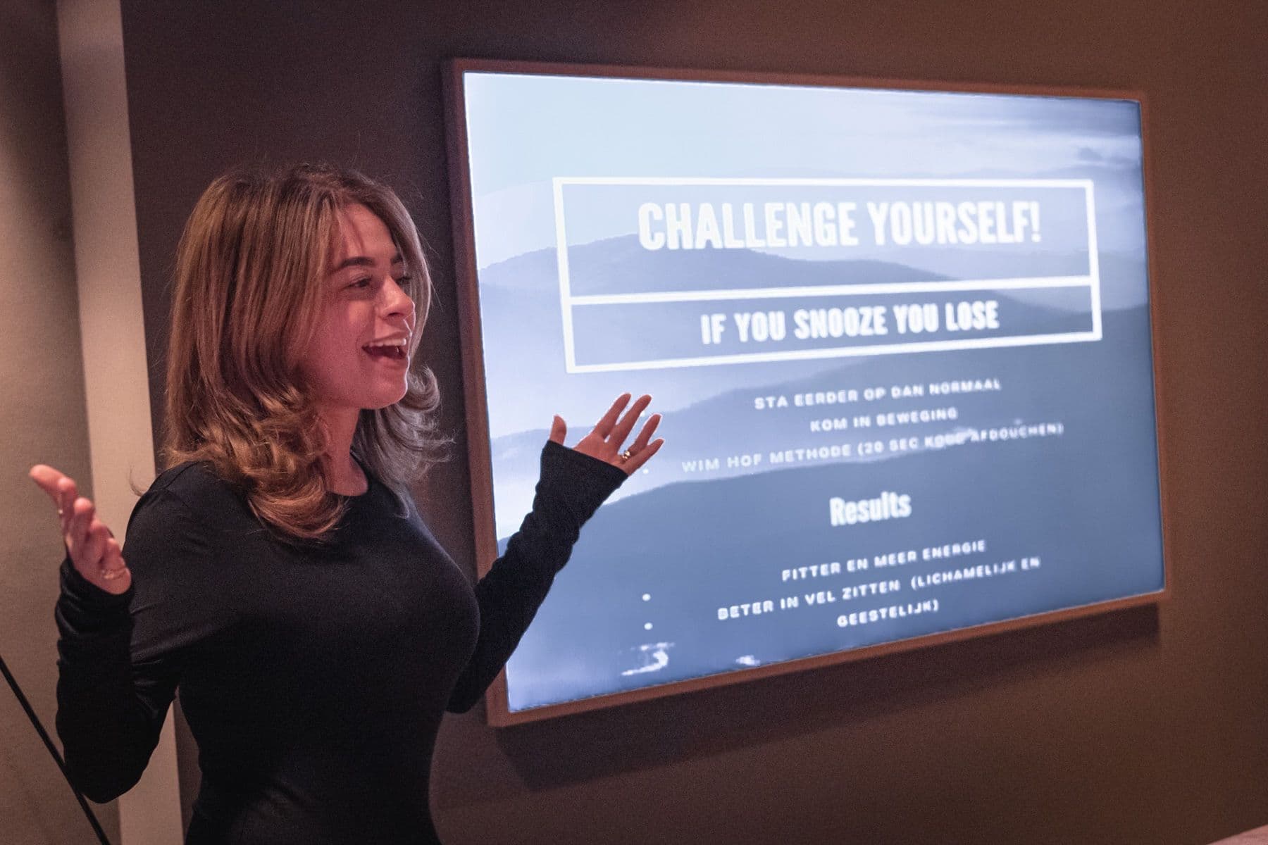 Vervolgens begonnen we met de presentaties. Iedereen had 1 slide die ze mochten vormgeven. De een sprak over MidJourney en GitHub Copilot en de ander over de voordelen van vroeg opstaan en het nemen van een koude douche om de dag te beginnen.