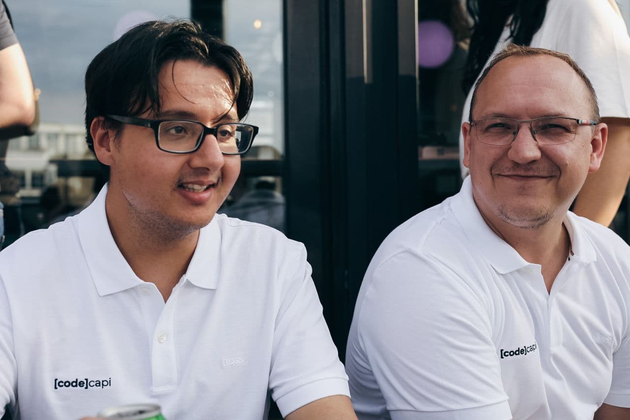 Anthony Sitaram en Jonas van Ineveld op het balkon bij onze GraphQL meetup.