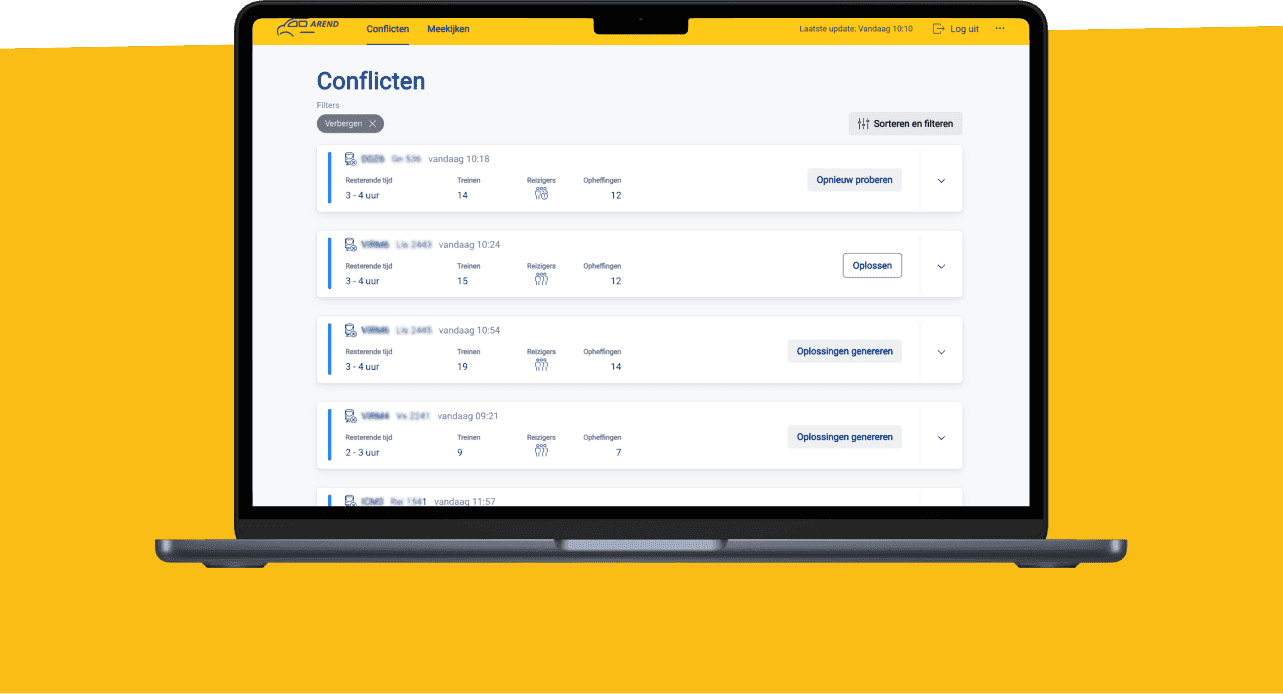 Een trein bestaat uit meerdere stellen en een stel is het materieel. Als hier een probleem mee is, dan wordt dat als conflict gesignaleerd en in de Arend weergeven. Voorheen moest de klant handmatig alle conflicten signaleren in een veel grotere lijst met ingeplande werkstellen. Als de medewerker verloren gaat, dan gaat de kennis ook verloren en dat heeft het team geprobeerd te automatiseren met de Arend.